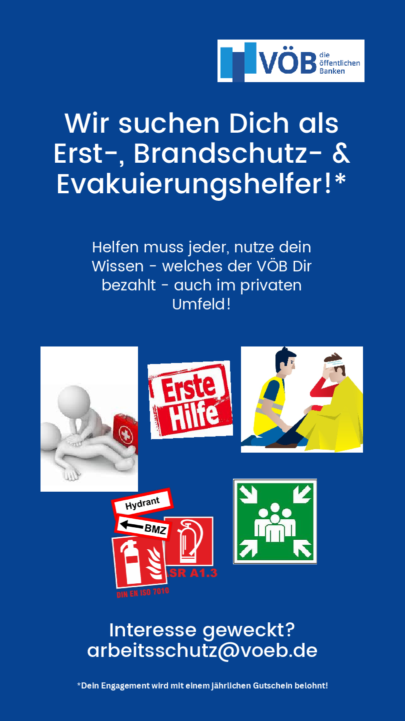 Haben Sie Interesse? - Dann schreiben Sie uns gerne eine Mail an arbeitsschutz[at]voeb.de und geben Sie an, welche Ausbildung Sie interessiert. Bitte geben Sie auch an, ob Ihnen eine Schulung an einer Ausbildungsstätte heimatbezogen oder in den Räumen des VÖB entgegenkommt.